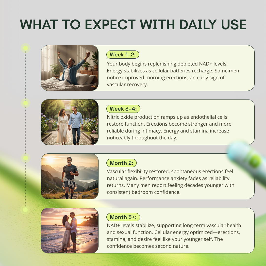 This isn't a pill you pop before sex. It's cellular restoration that takes time—but delivers lasting results. Here's what men experience as NAD+ rebuilds: